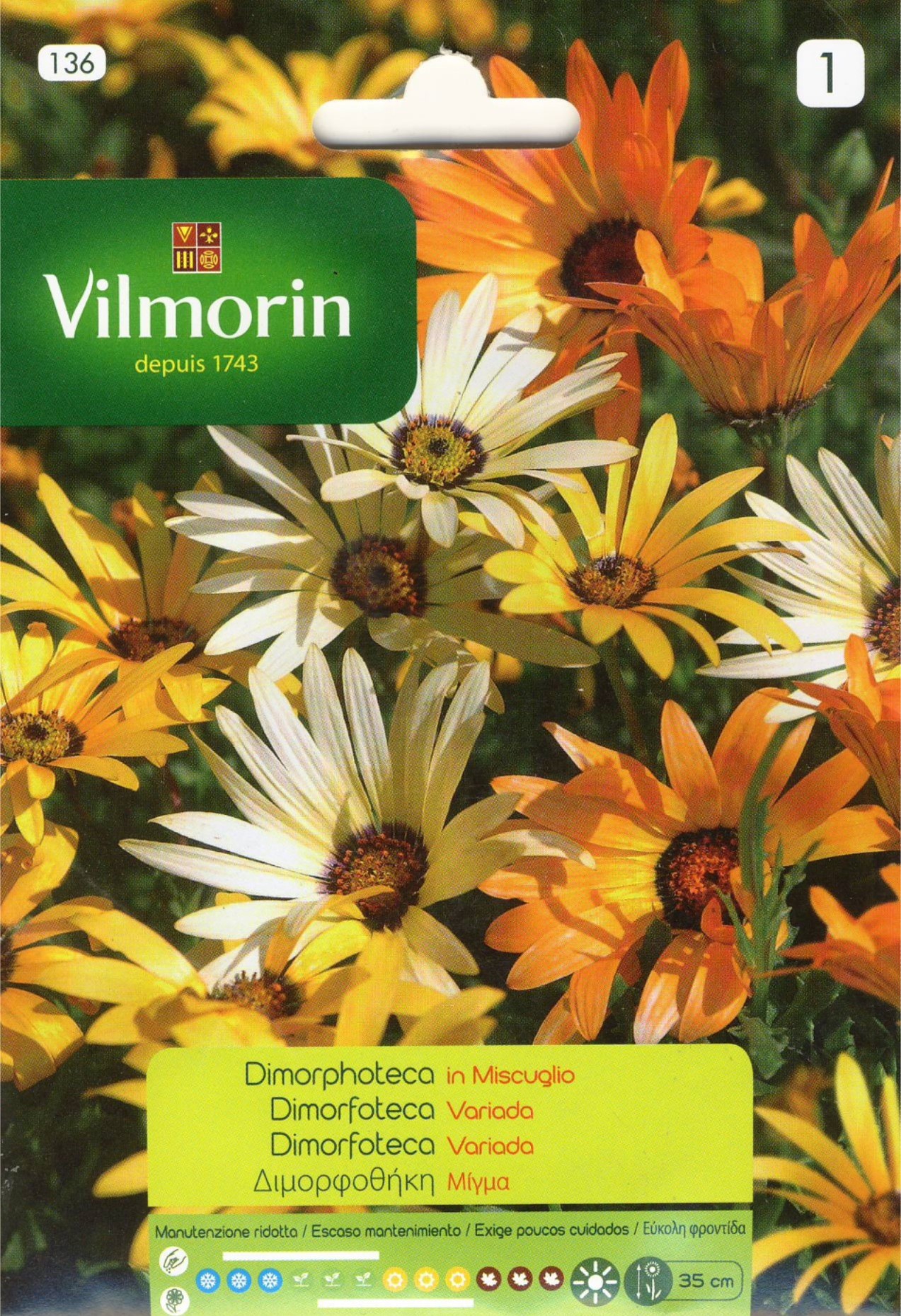 Dimorphoteca. Planta de floración abundante y de larga duración con coloridos luminosos. Para asociar en segundo plano en macizos, con otras plantas. Soporta muy bien la sequía y el pleno sol. Sembrar directamente en el sitio, a voleo. Aclarar varias veces. Floración 2 meses después de la siembra. Altura de la planta 35 cm.